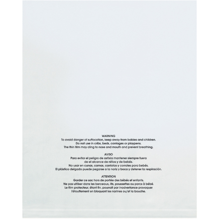 • Bag is printed: WARNING: To avoid danger of suffocation, keep away from babies and children. Do not use in cribs, beds, carriages or playpens. The thin film may cling to nose and mouth and prevent breathing.